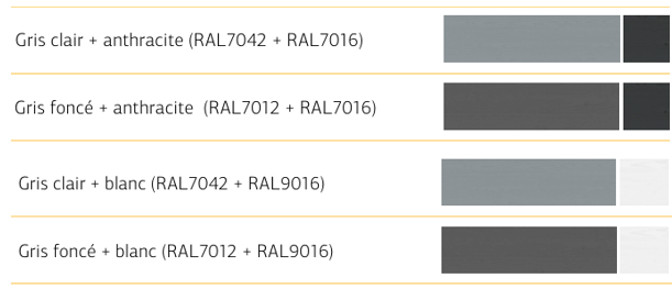 Pour chacune de ces options de peinture, nous utilisons deux couleurs : une couleur principale pour la structure principale de l'abri, et une couleur secondaire pour les détails de finition (encadrements de portes et fenêtres, angles, etc.). Cette approche permet de créer un ensemble visuellement cohérent et esthétiquement agréable.