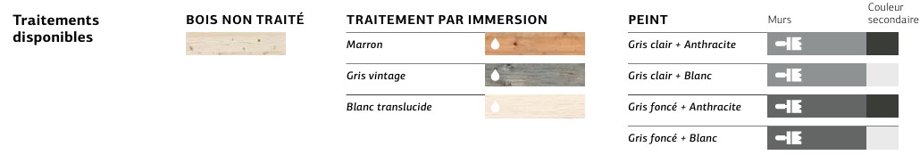 Pour préserver la beauté naturelle du bois et le protéger des agressions climatiques, nous proposons un traitement par bain disponible en quatre teintes : Naturel, Marron, Gris et Translucide. Cette option permet de conserver l'aspect authentique du bois tout en assurant sa durabilité.