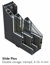 La porte coulissante Slide Plus est équipée d'un double vitrage trempé de 4-16-4 mm, assurant une bonne isolation phonique et une sécurité accrue. L'ensemble est proposé dans un élégant coloris RAL7016 (aluminium brillant à 30%). Un double joint brosse autour du rail bas garanti une étanchéité optimale.