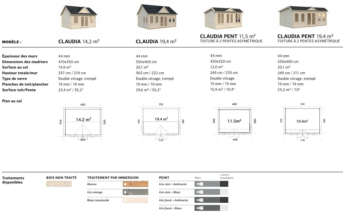 Abri de jardin deux pentes asymétrique Claudia 19,4 m2 en bois 44 mm au choix avec plancher