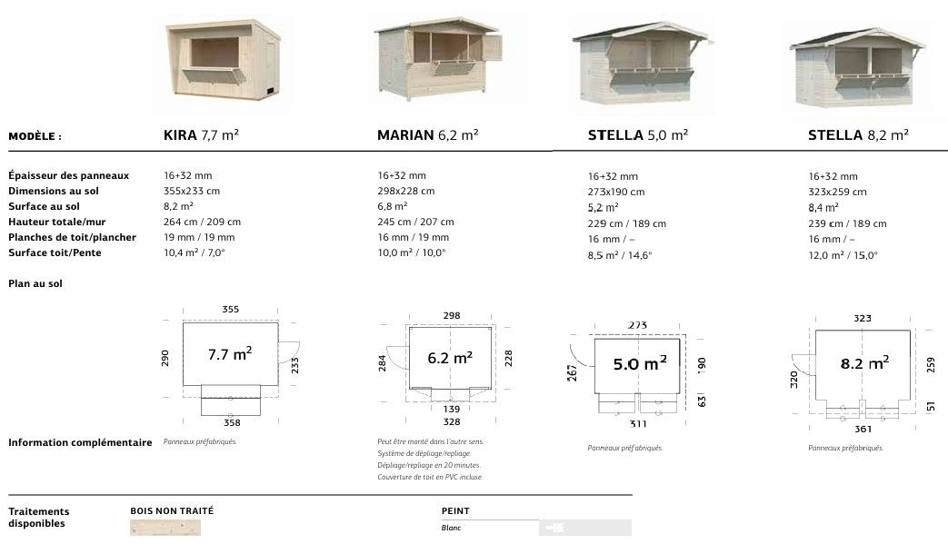Si vous préférez l'esthétique classique et intemporelle des structures à double pente, nous proposons des solutions robustes et fonctionnelles. Le modèle Marian 6,2 m2 se distingue par son caractère pliable, idéal pour les commerçants itinérants cherchant une installation rapide et un transport simplifié. La gamme Stella, disponible en formats de 5,0 m2 et 8,2 m2, allie charme traditionnel et praticité pour s'intégrer harmonieusement dans tous les paysages urbains ou balnéaires.