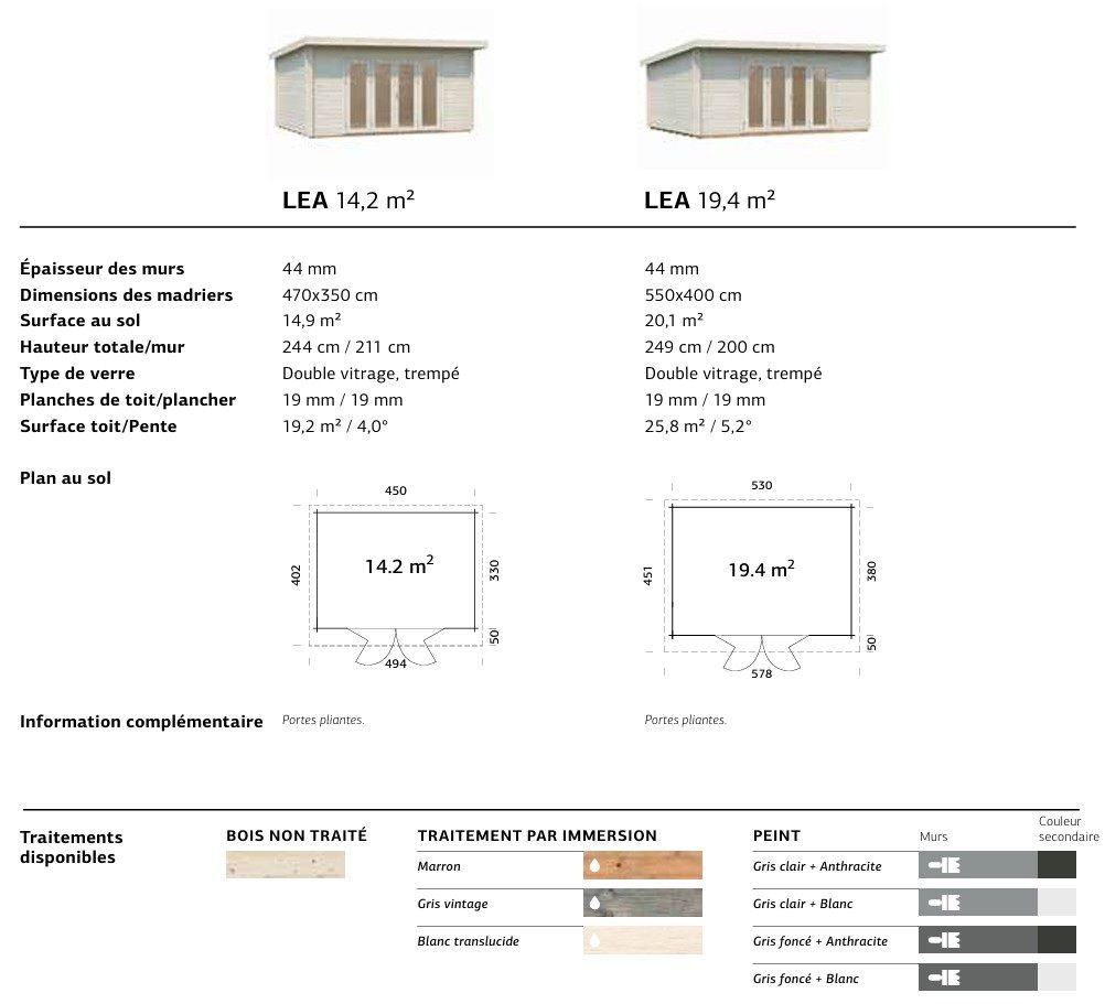 Personnalisez votre chalet LEA grâce à nos finitions disponibles en traitement par bain (Naturel, Traité Marron, Traité Gris et Traité Translucide) ou en peinture (Gris clair anthracite, Gris foncé anthracite, Blanc anthracite).