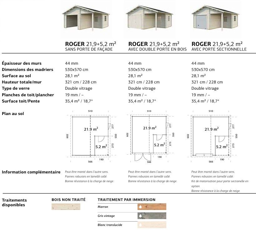 Garage toit deux pentes ROGER 21,9+5,2 m2 en bois 44 mm avec porte sectionnelle traitement au choix