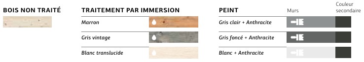 LISANDRA est disponible en plusieurs traitements : bois non traité pour un aspect naturel, traitement par immersion (marron, gris vintage et blanc translucide) pour une protection optimale, ou encore peints (gris clair anthracite, gris foncé anthracite et blanc anthracite) pour une esthétique contemporaine